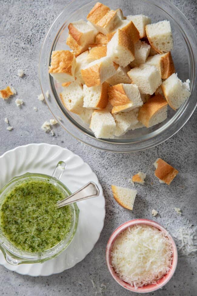 Additionally, bread that is a day or two old is best; that’s because it’s easier to cut and it doesn’t become overly soggy when tossed in pesto and olive oil. We use day old bread to make these Herbed Croutons and Parmesan Croutons as well.