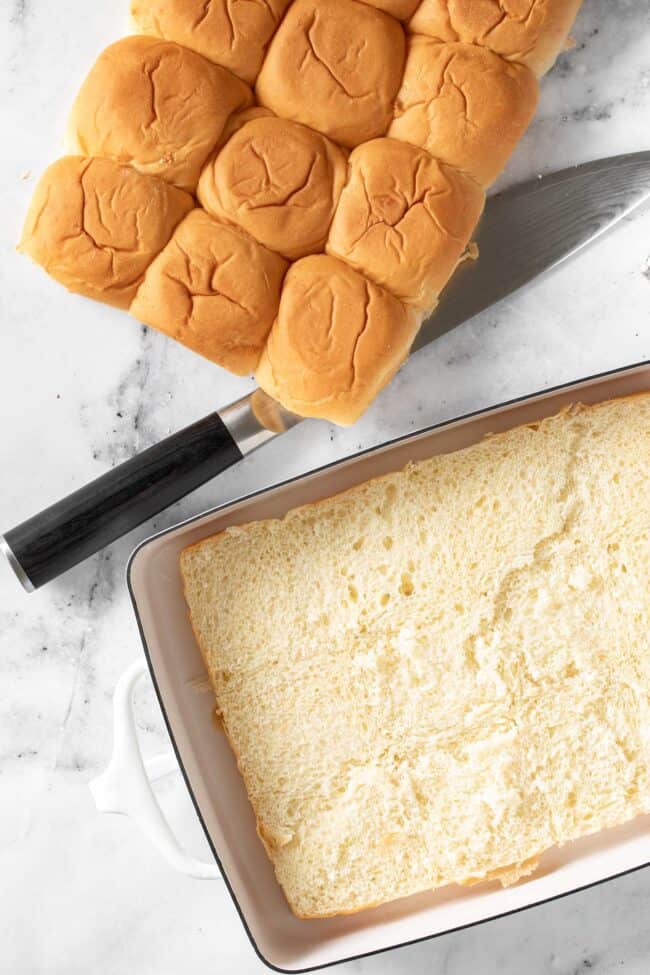 - Slice rolls. Using a long sharp knife, slice through all of the rolls so there is a top and a bottom (but leave all of the individual rolls attached to the whole).