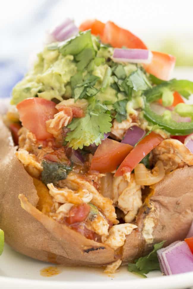 This Chicken Fajita Stuffed Sweet Potatoes recipe is a family friendly meal to make any night of the week. These Mexican stuffed sweet potatoes are made with a stewy chicken fajitas mixture, guacamole and pico de gallo. They are so good and so easy to make!