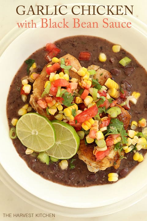 This Garlic Chicken with Black Bean Sauce has a really incredible combination of flavors. Tender marinated chicken is served with a richly flavored black bean sauce and a simple corn salsa.