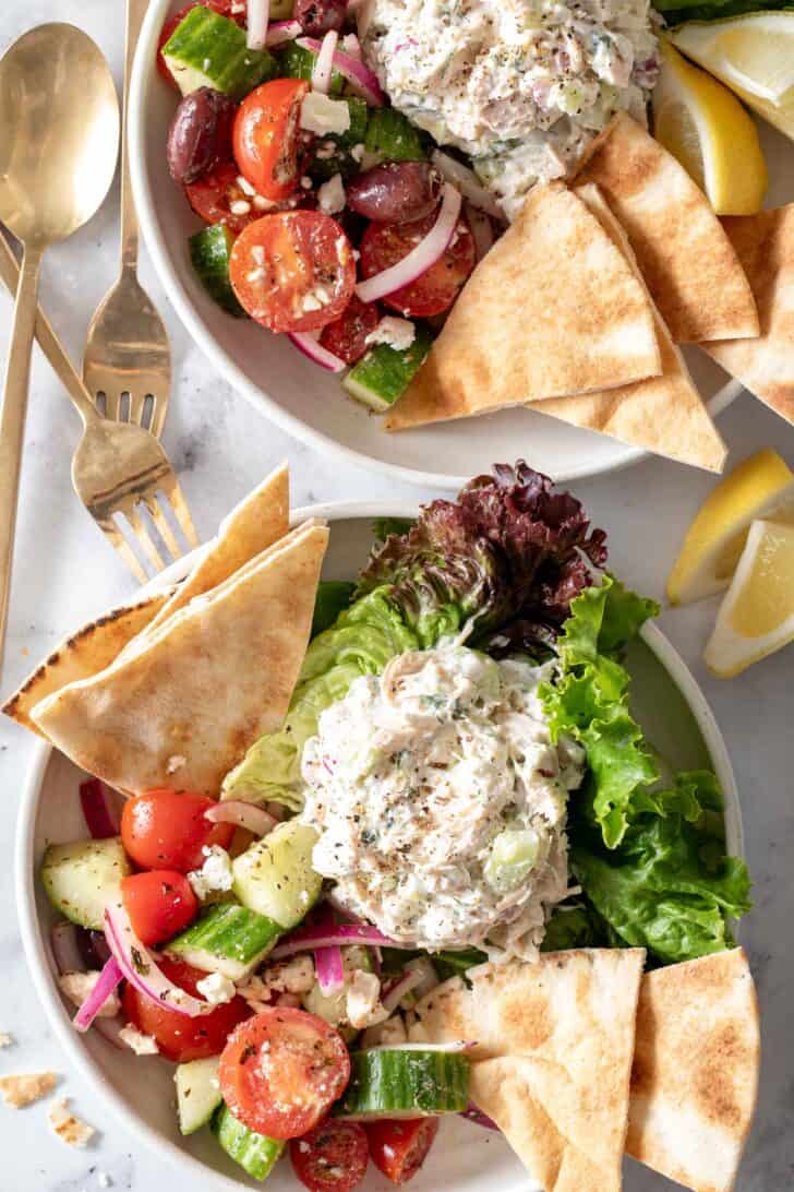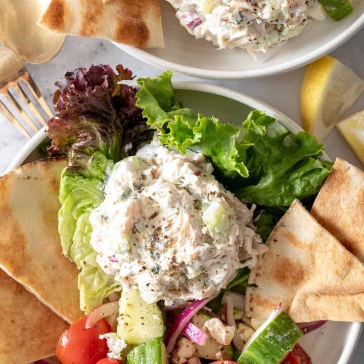 If you’re looking for a quick, easy and healthy lunch idea, this Greek Tzatziki Chicken Salad checks all the boxes. You can use leftover chicken or store-bought rotisserie chicken to make this salad. This chicken salad with tzatziki sauce is delicious, healthy, easy to make and it’s a family favorite.
