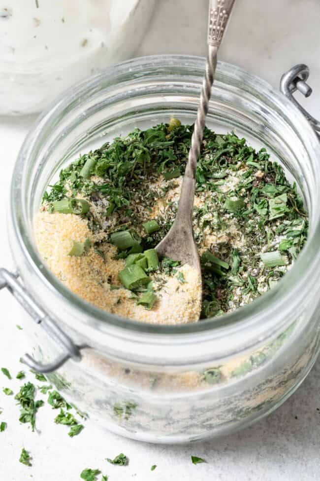 This Homemade Ranch Seasoning recipe is made with seasonings you may already have on hand, and it’s healthier than the packet stuff because you can control the amount of salt that goes into it, plus there’s no additives or MSG. The recipe for this ranch dressing seasoning is made with dried dill, parsley, chives, onion powder, garlic powder and salt and pepper.