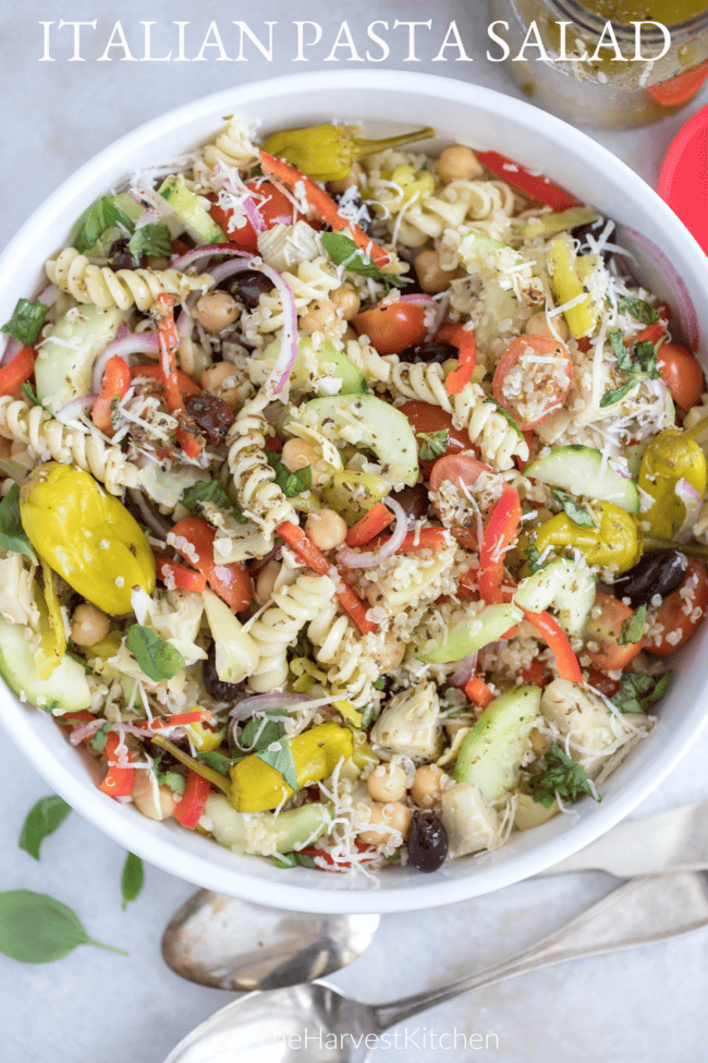 This Italian Pasta Salad with Quinoa recipe is a healthy pasta salad loaded with quinoa, chickpeas, noodles, cucumbers, cherry tomatoes, olives and peperoncini all tossed in a delicious Italian dressing.