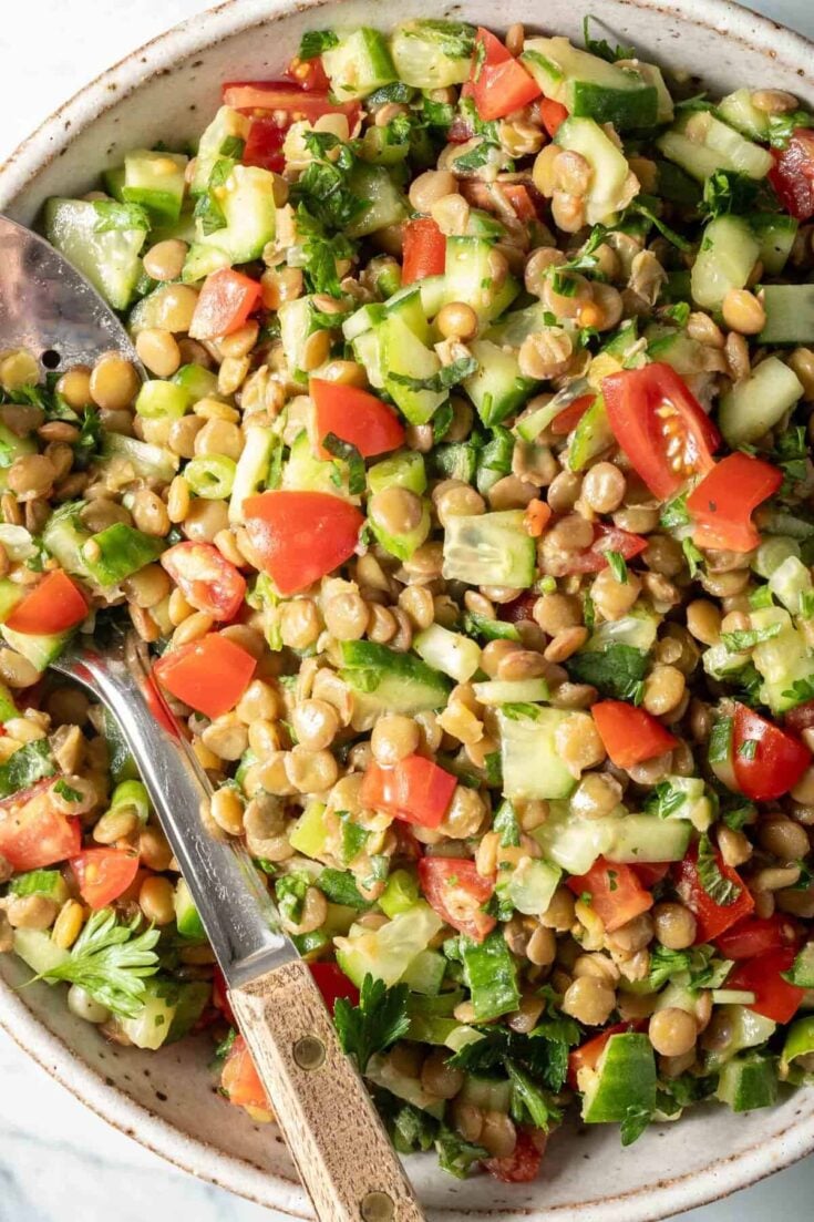 Lentil Tabbouleh Salad in a white bowl with a spoon.