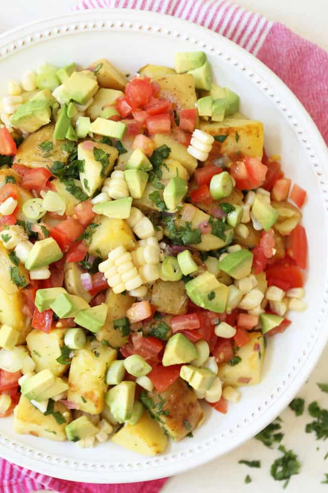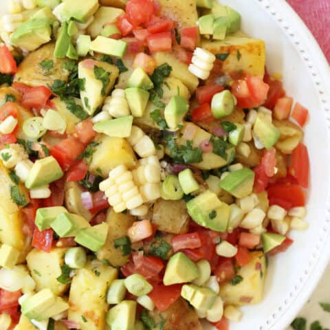This recipe for Mexican Potato Salad is loaded with fresh crunchy corn, tender juicy ripe tomatoes, buttery avocado and onions, then the whole ensemble is perfectly dressed in a delicious cilantro lime vinaigrette.