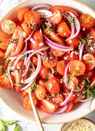 This easy Italian Tomato and Onion Salad recipe is made with Roma tomatoes, cherry tomatoes, red onion and fresh basil all tossed in a...