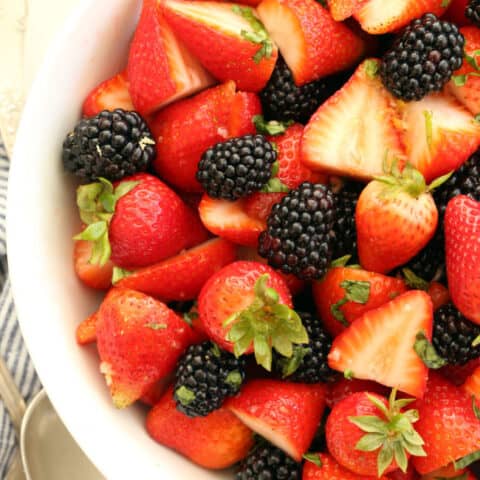 This berry fruit salad is popular to serve as a side at potlucks and barbecues, but it’s also wonderful served with frozen yogurt or ice cream as a dessert, and it’s always a hit for brunch served with granola and yogurt.