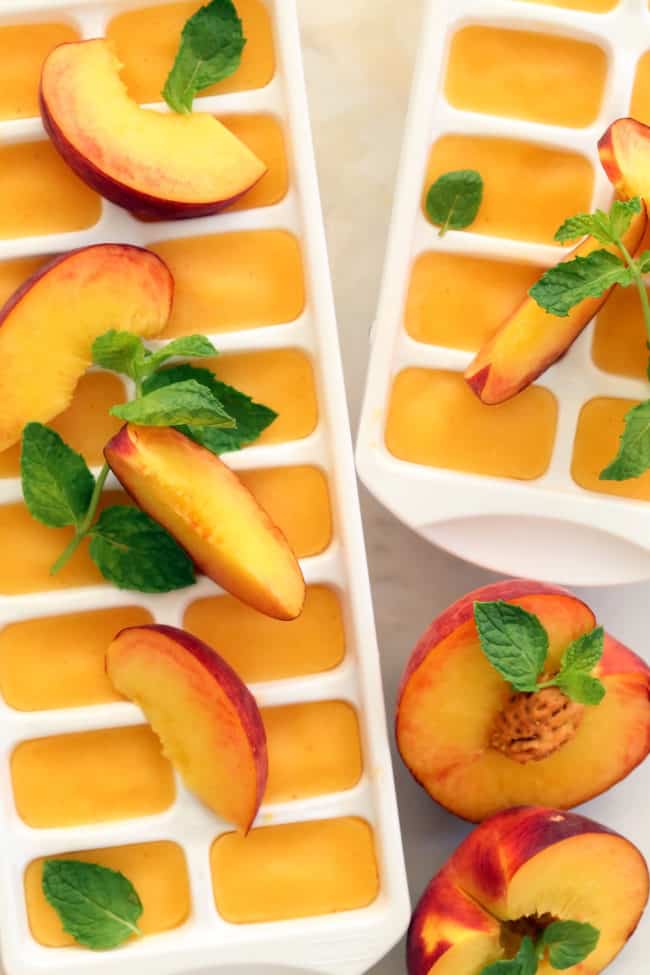 These Summer Peach Ice Cubes are made with peach puree and will transform a tall glass of water or your favorite iced tea into a delicious summer drink.