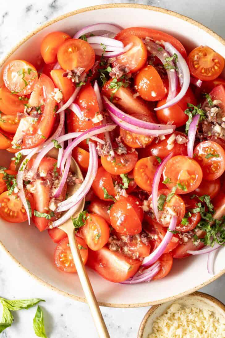 Our easy Italian tomato and red onion salad comes together in about 15 minutes. To make it, we start out by whisking together the ingredients for the dressing. Then slice the onions and prep the tomatoes. Put it all in your favorite salad bowl and give it a quick toss, then drizzle with vinaigrette toss it all together. Toss in the basil and gently toss again.